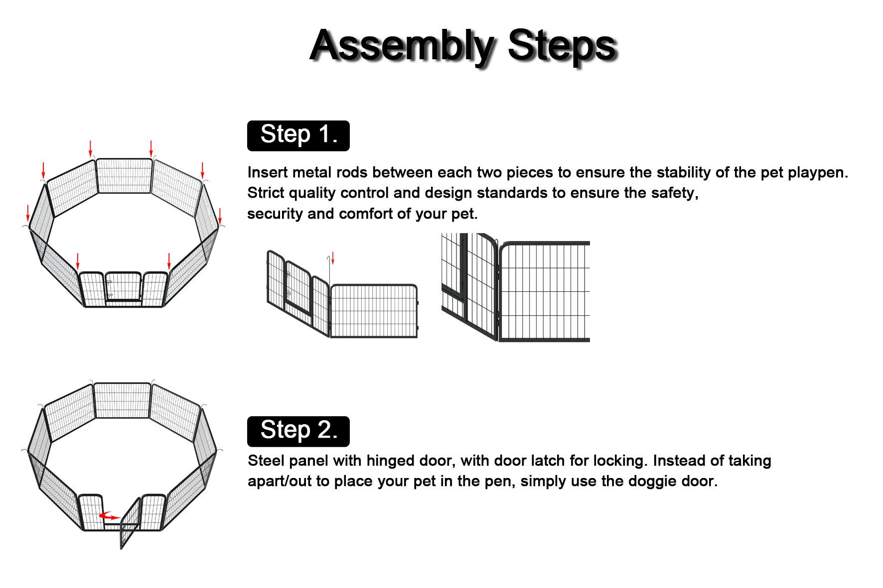 1.Specifications:Our pet playpen includes 8-panels which are made of iron tubes. Dimension for Each Panel: 31.5’’x40’’x 0.6’’(W x H x Thickness). Dimension for Each Door: 31.3’’ x 15.5’’ (H x W).