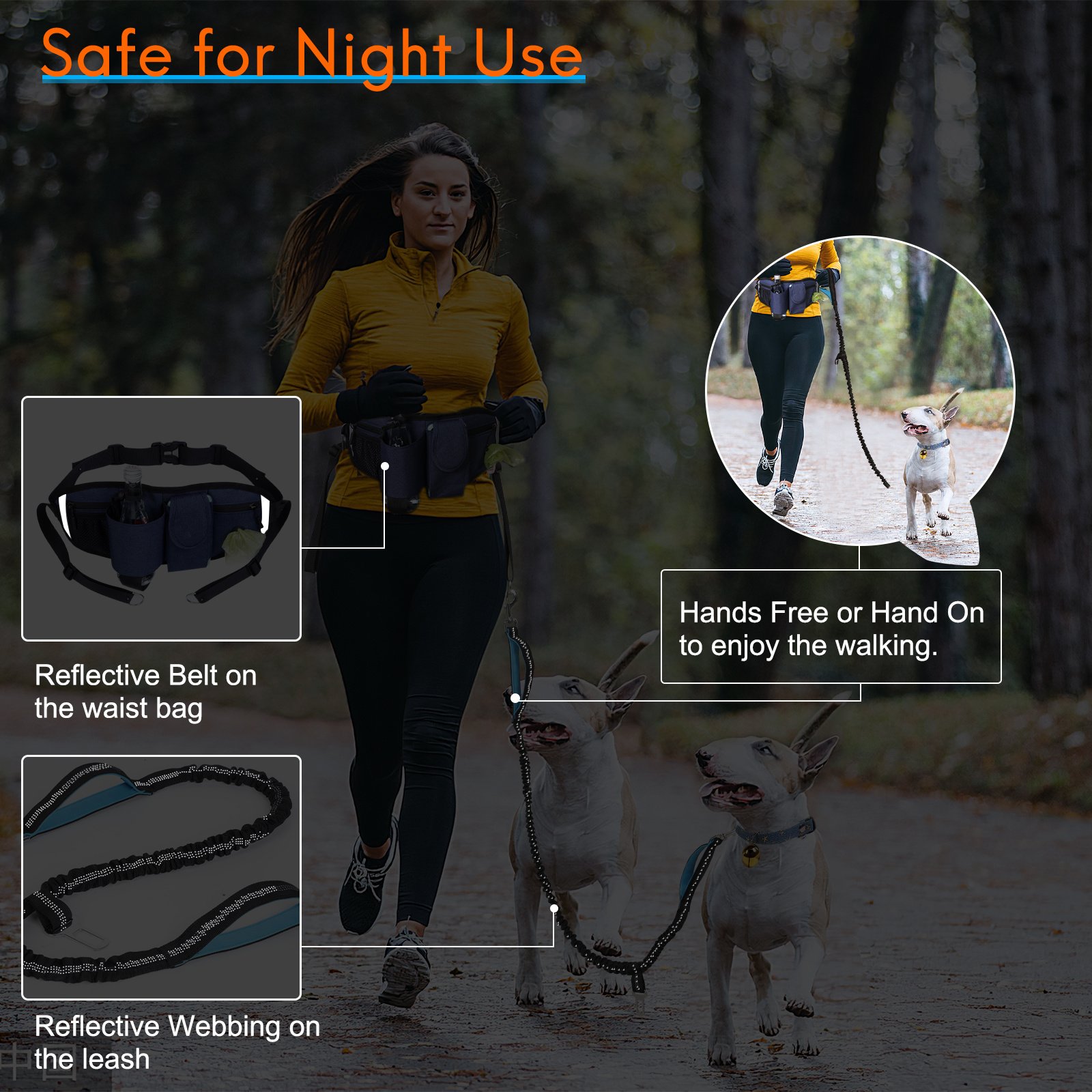 3.Be Safe and Reflective at Night,Reflective belt on the waist bag and reflective webbing on the leash, be safety and visible for both you and pets, enjoy walking with your dogs at night or running in the early morning.
